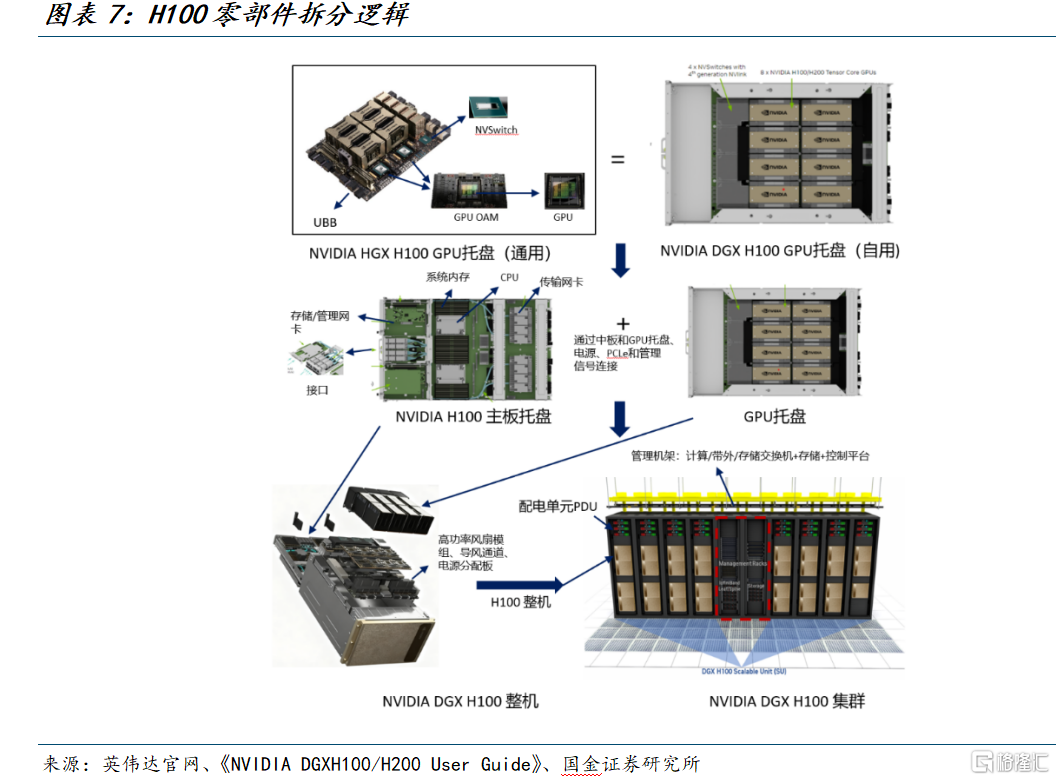 当前市场对于AI计算机乃至于计算中心的材料讨论都是集中于某一个材料深挖,我们想以更加全面的视角将AI计算机的组成材料整体梳理清楚,寻找值得重点关注的方向。以英伟达DGX H100整机为例,AI数据中心架构大体都遵循着“芯片—模块—互联—托盘—主机—机架—集群”的层层放大逻辑,目标是在标准化封装与高带宽互联的约束下,把单点算力有效汇聚为可编排的集群算力。