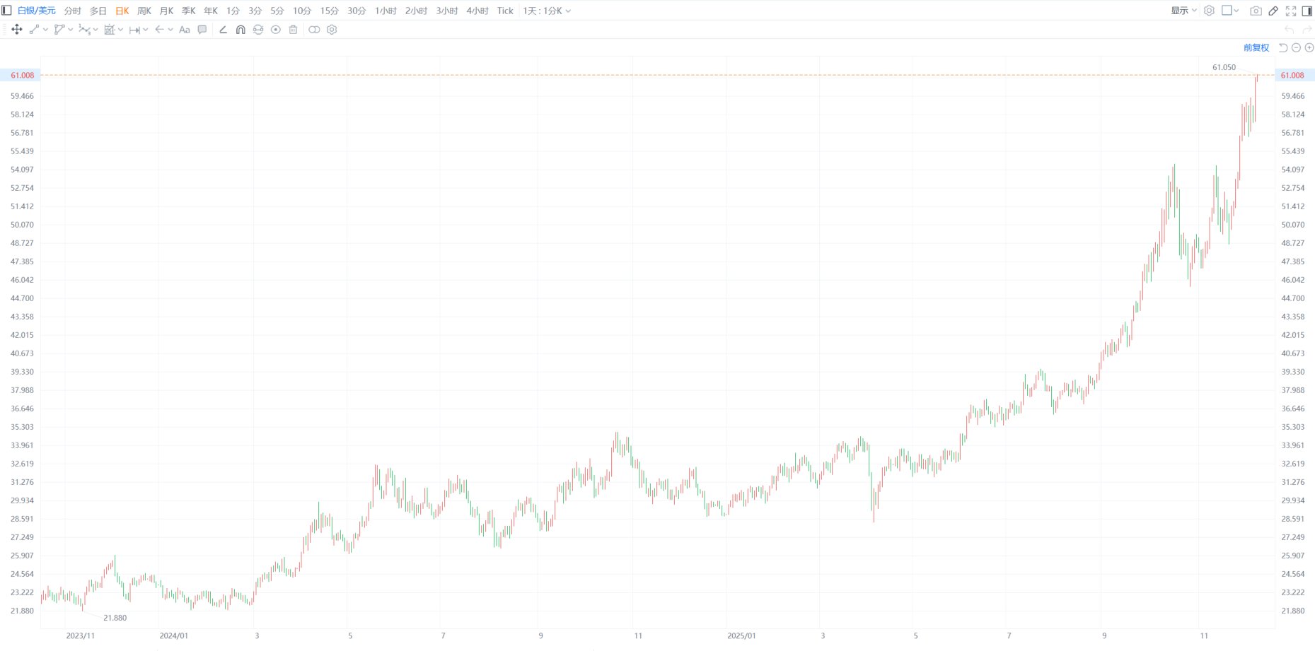 现货白银短线拉升,站上61美元/盎司,续创历史新高,日内涨0.6%。
