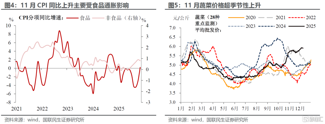 与PPI的不及预期相比,CPI的大幅回升则形成鲜明反差。11月CPI同比增速录得0.7%,较前值0.2%的水平明显回升。不过从驱动因素来看,此次CPI回升更多源于蔬菜等食品类价格的季节性反弹,受前期极端天气及生产流通环节短期扰动影响,部分生鲜农产品供应阶段性收紧,叠加年末需求的上升,带动食品分项通胀快速上行,整体通胀的结构性特征较为突出。