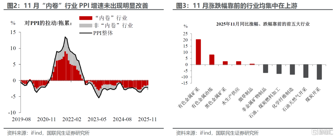 看似微小的数据“预期差”,实则是重要的政策节奏变化。11月PPI同比增速实际录得-2.2%,略低于-2.0%的市场预期。这一偏差的背后,主要反映了年末“反内卷”政策步伐有所放缓。我们测算显示,11月“内卷”行业的PPI同比增速与上月基本持平,未能如前期那样显著收窄其对整体价格的拖累,这最终导致PPI同比增速不及预期。