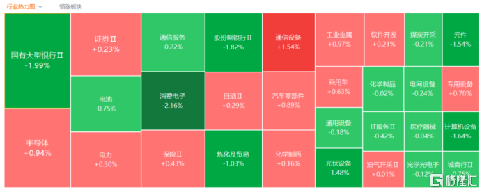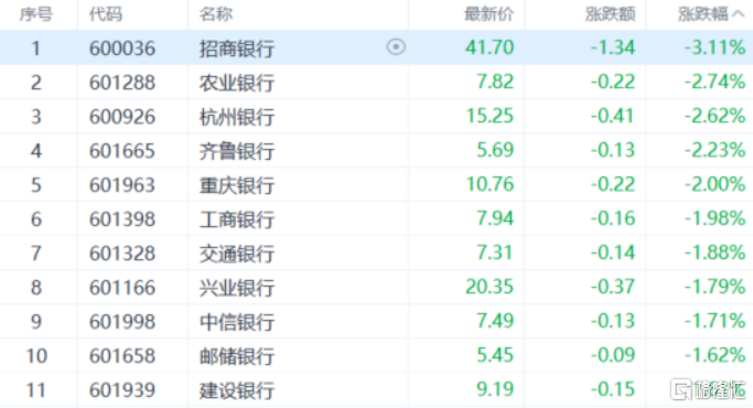 银行板块走弱,招商银行跌3%,农业银行、杭州银行、齐鲁银行、重庆银行、工商银行、交通银行等多股跟跌。