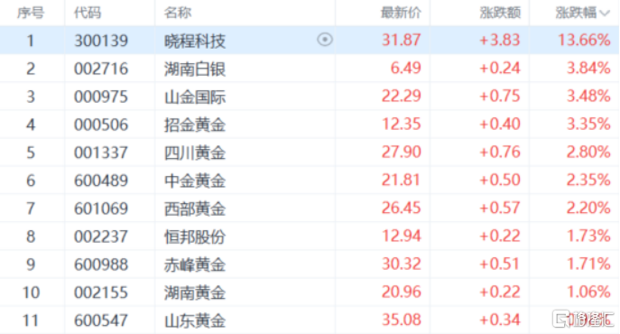 贵金属板块上涨,晓程科技涨超13%,湖南白银、山金国际、招金黄金、四川黄金、中金黄金等多股跟涨。