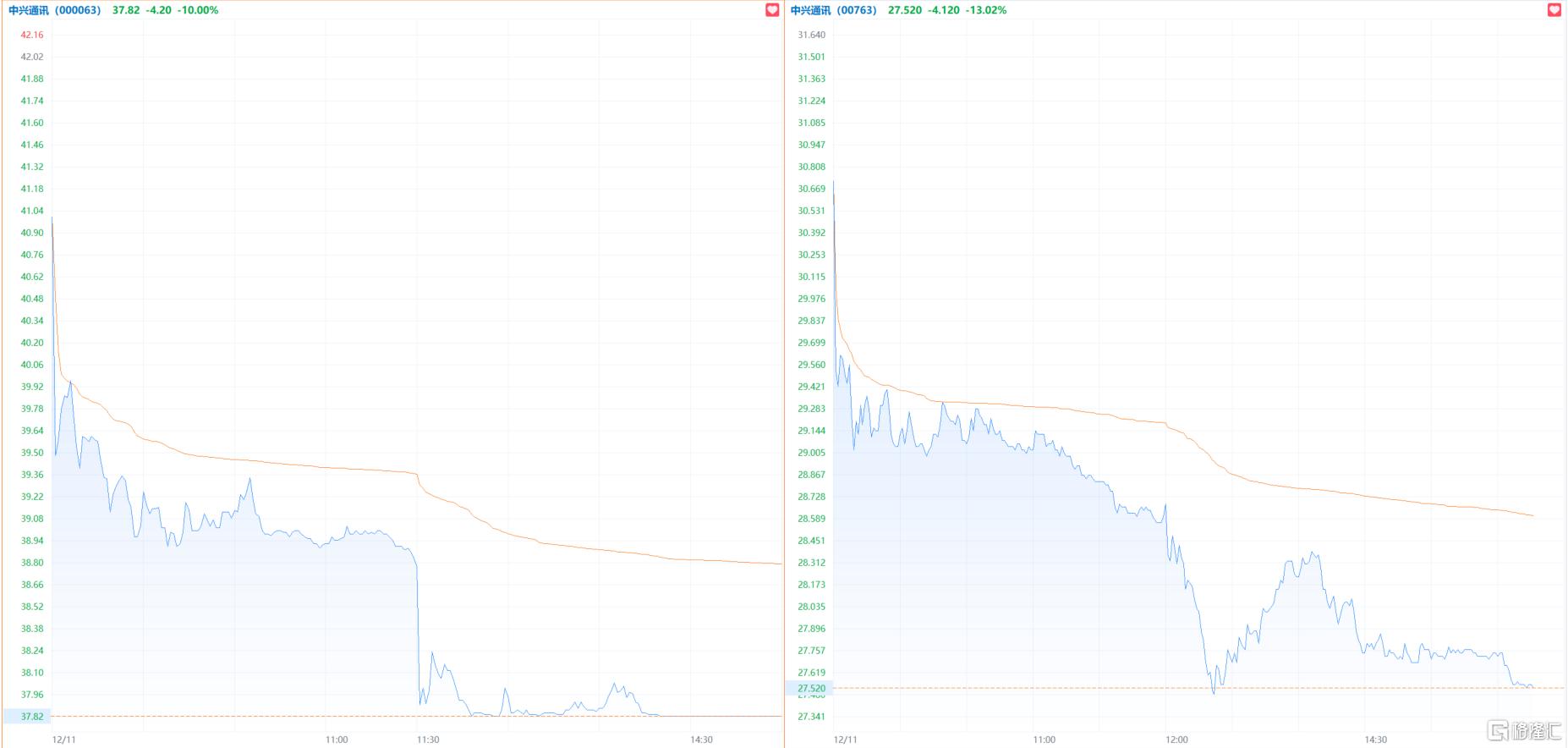 此外,中兴通讯在港上市的认购证“中兴法巴六五购A”一度暴跌超38%。