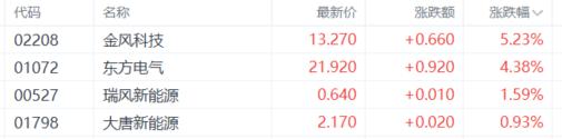 风电股涨幅居前,金风科技涨超5%,东方电气、瑞风新能源、大唐新能源跟涨。