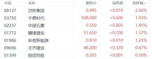 另一方面,风电股涨幅居前,金风科技涨超5%;锂电池股活跃,宁德时代涨近2%;银行股走高,渣打、汇丰齐创历史新高;此外,消费电子产品、农业股、港口运输股、燃气股、啤酒股、地产股等上涨。