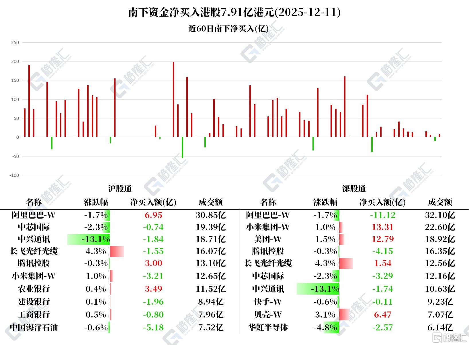 12月11日,南下资金净买入港股7.91亿港元。其中,港股通(沪)成交净卖出3.2亿港元,港股通(深)成交净买入11.11亿港元。