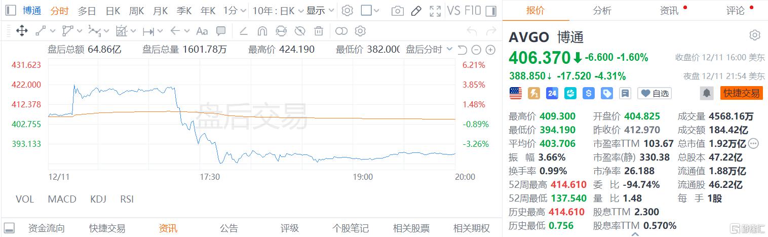受此影响,博通股价在盘后交易中一度上涨5%,随后逆转涨势,跌幅超4%。