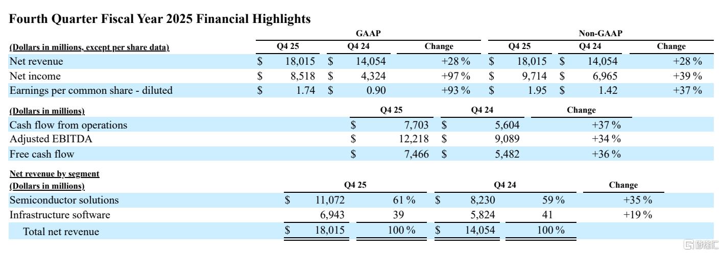 财报显示,博通第四财季营收180.2亿美元,同比增长28%;净利润97.1亿美元,同比增长39%。