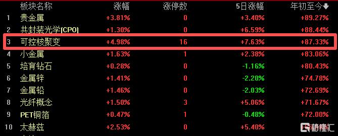 今年迄今,可控核聚变以87.33%的累计涨幅位列A股市场热门板块第三名,贵金属、CPO板块则仅以微弱优势居第一、二位。