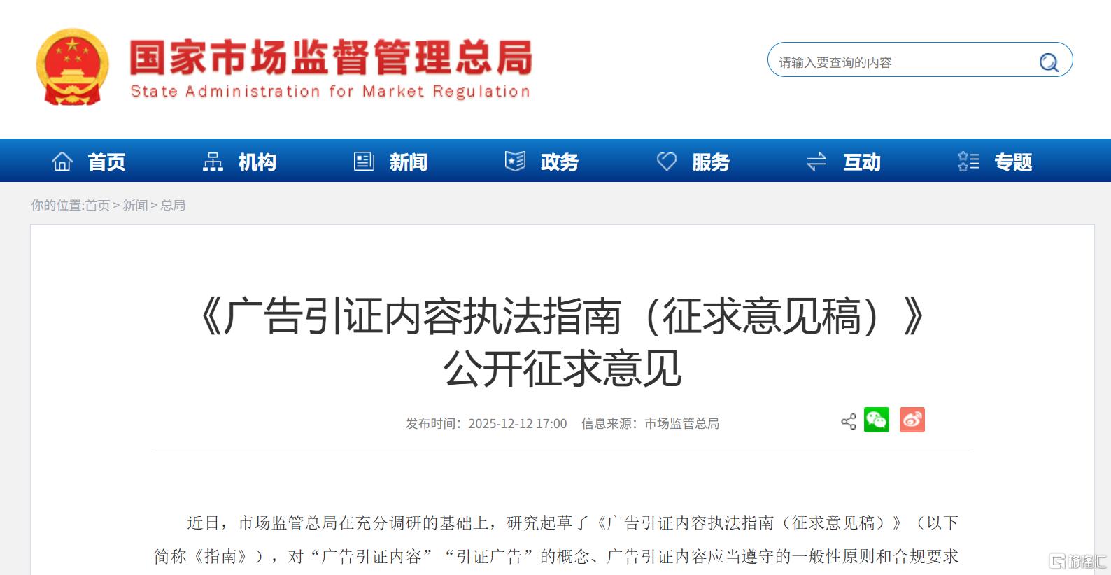 为落实《中华人民共和国广告法》规定,进一步完善广告监管制度,针对当前广告市场反映比较集中的利用在广告中引用第三方报告,批量制造细分领域“行业第一”、加剧行业“内卷”,以及利用“大字吸睛,小字免责”方式,对“内卷式”竞争“推波助澜”等问题,市场监管总局起草了《广告引证内容执法指南(征求意见稿)》,以进一步规范市场监管部门广告引证内容监管工作,引导和帮助广告活动主体提升广告引证内容合规能力。现向社会公开征求意见,欢迎各有关单位和公众研提意见,并于2026年1月12日前反馈市场监管总局。