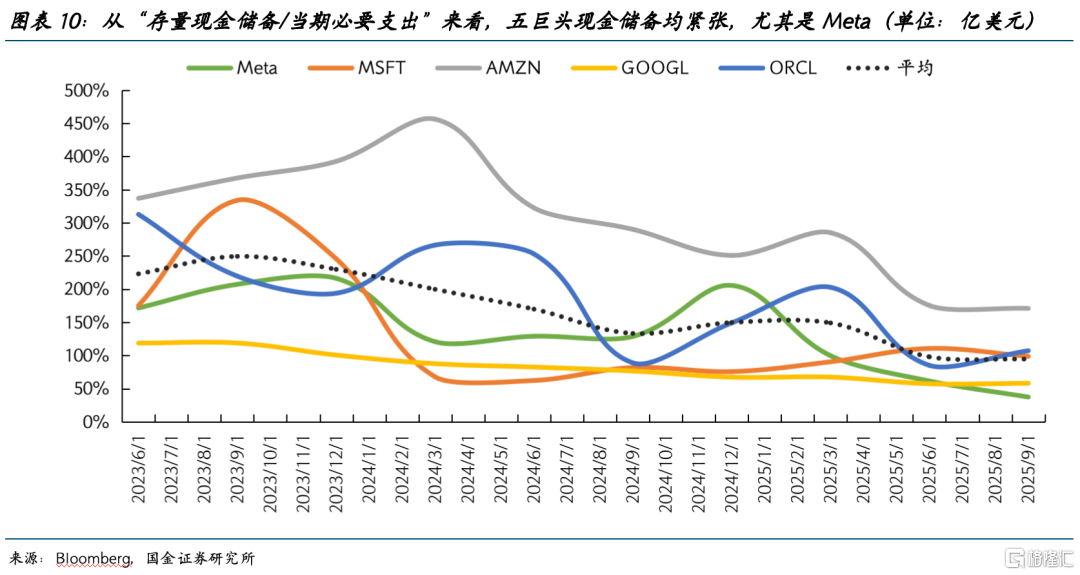 从期末期初平均现金储备对当期必要支出(Capex+债务净偿还+股利支付+回购支出)的覆盖率来看,截至2025Q3,五家公司平均值为94.4%,较一年前下降了39个百分点,其中Meta仅为37.3%,存量现金储备的安全垫未来可能更加稀薄。