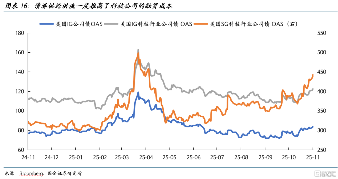 今年前11个月,美国Hyperscaler企业债的总发行量达到1038亿美元(不包含贷款与私募信贷),是2024年全年发行量(201亿美元)的5倍以上,规模加权利率也从4.75%上升至4.91%。供给激增已经推高了债券利差,10月1日到11月18日,甲骨文、Coreweave的5年期CDS分别上升49个基点、304个基点,美国投资级(IG)科技企业债、投机级(SG)科技企业债OAS利差也分别上行。