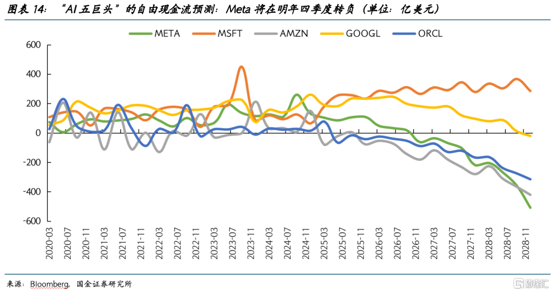 从自由现金流(CFO-Capex-债务净偿还)来看,截至2025Q3,五家重投资的AI巨头中,甲骨文的自由现金流已在“水下”,难以支撑同期巨额资本支出,只能靠消耗存量现金和加码外部融资来维持。