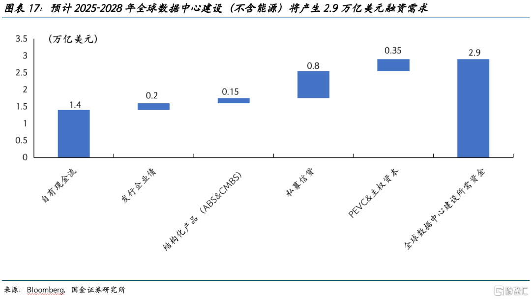市场普遍认为,仅公开发行企业债恐难以填补巨头们庞大的资金缺口。据预测,2025-2028年全球数据中心建设将产生2.9万亿美元的Capex需求,其中1.5万亿美元来自外部融资(2000亿美元公司债、1500亿美元ABS与CMBS产品、3500亿美元PEVC和主权资本,8000~1.2万亿美元依赖私募信贷市场)。私募信贷产品评级和持有人的不透明性,将成为巨大的风险。