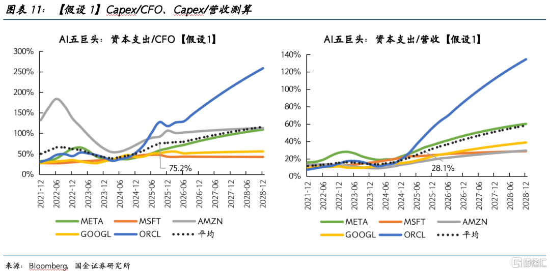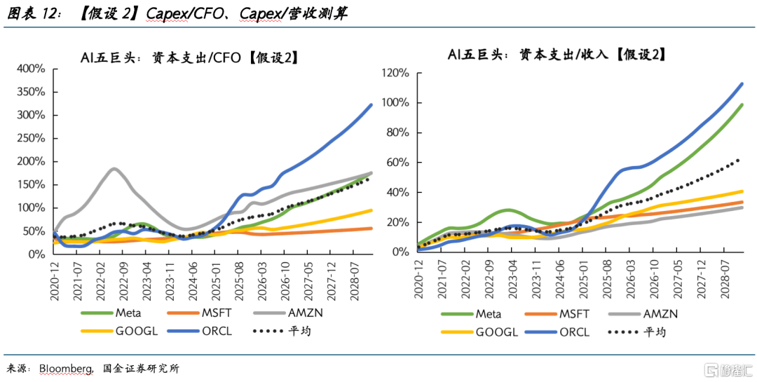 【假设2】将AI五巨头的资本开支以市场预期中值的2025-2028年复合增速(CAGR)计算,营业收入、净利润基于彭博一致预期,并保持经营性现金流与净利润的趋势比例不变:到2026年三季度,AI五巨头平均Capex/CFO将达到96.9%,即英特尔在泡沫破裂后的峰值;到2026年四季度,AI五巨头平均Capex/营收将达到38.7%,逼近英特尔在泡沫破裂后的峰值。