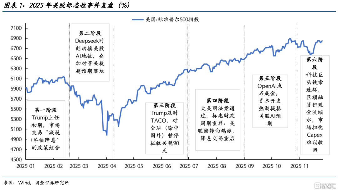2025年美股经历了关税冲击、财政转向、产业浪潮交织中的历史性一年。“Deepseek时刻”与4月“独立日关税”分别引发市场地震,但冲击之后美股的韧性仍在不断显现。三季度以来OBBBA法案和美联储鸽派转向在财政与货币两个层面带来利好,OpenAI则宣布了一系列与英伟达、甲骨文等公司的重大投资协议,人工智能热潮推动市场情绪升至新高。