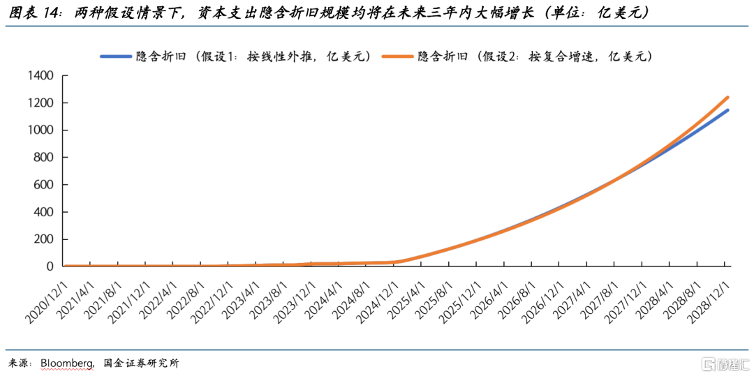 以【假设1】测算,Capex隐含折旧将从2025三季度的149亿美元增长至2028年年底的1145亿美元,约翻7.7倍。到2026年底、2027年底、2028年底,Capex隐含折旧/预期净利润将分别达到37.6%、60.2%、82.0%。