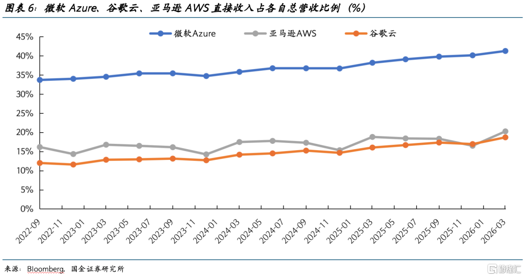 另外,从AI产业链来看,当前上下游的盈利能力明显分化。以英伟达为代表,上游芯片制造商最先享有高盈利,受益于AI芯片需求爆发,他们的产品溢价能力与订单能见度较强。中游云服务提供商也具备清晰的商业模式。亚马逊、谷歌、微软等构建了极具韧性的商业模式,将AI深度融合到各自的核心业务中,形成了坚实护城河,近两年来三家巨头各自的云业务收入占比也呈逐步上升趋势。甲骨文抓住了AI训练和推理所需的巨大算力需求,其云基础设施与OpenAI、Meta、xAI等头部AI公司的天价合同,为未来数年锁定了巨额收入。但下游模型商竞争激烈。盈利能力已呈现显著分化。OpenAI这样的通用大模型提供商,需要承担天价的研发和算力成本,而Salesforce、Adobe等企业应用厂商可以在其成熟的SaaS产品上叠加AI,边际成本较低。从今年以来AI巨头各自股价的盈利、估值贡献率中可以看出,芯片商的盈利贡献率最高,云服务商其次,模型商最弱。