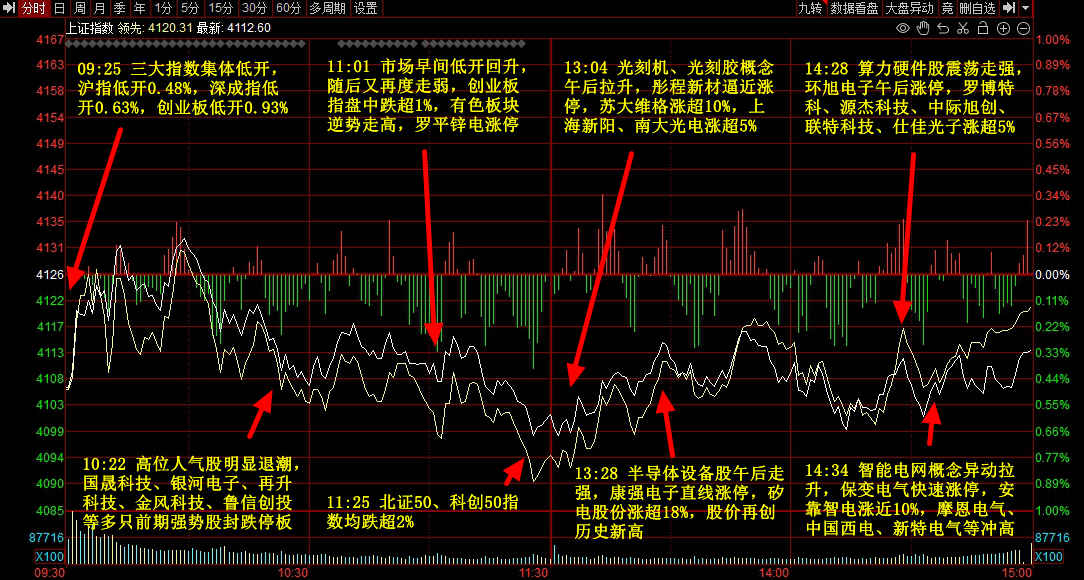 沪指全天震荡调整,创业板指探底回升。半导体芯片股午后走强,光刻机、光刻胶方向领涨,彤程新材、康强电子等多股涨停。旅游板块走势活跃,众信旅游2连板,陕西旅游、大连圣亚涨停。有色板块拉升,锌业股份、罗平锌电涨停。下跌方面,商业航天、AI应用集体退潮,中国卫星、航天动力、值得买等多只高位股跌停。个股跌多涨少,沪深京三市超3100股飘绿,今日成交2.94万亿,较上日缩量超1万亿。