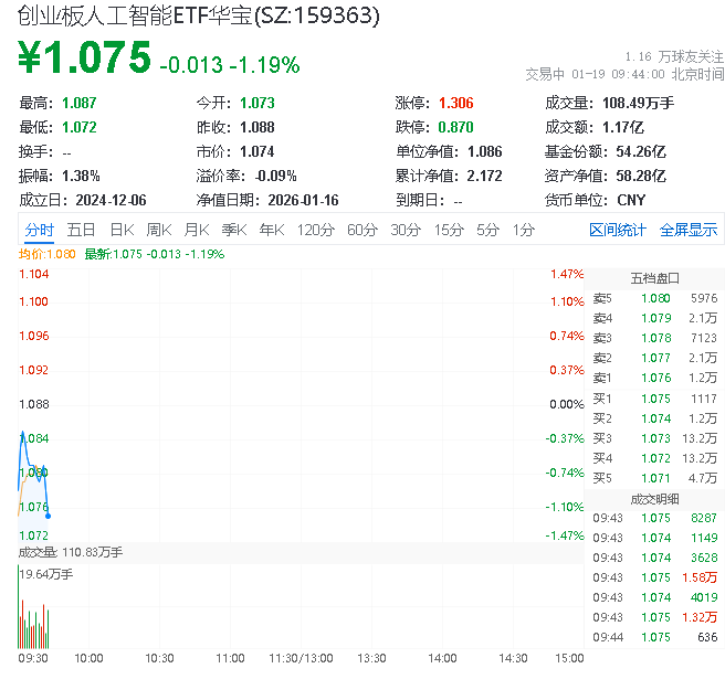 1月19日,截至9时43分,人工智能表现低迷,创业板人工智能指数下跌0.71%,成份股方面,航宇微领涨7.67%,蓝色光标上涨4.24%,首都在线上涨1.34%。锐捷网络领跌5.14%,太辰光下跌3.85%,联特科技下跌3.67%。