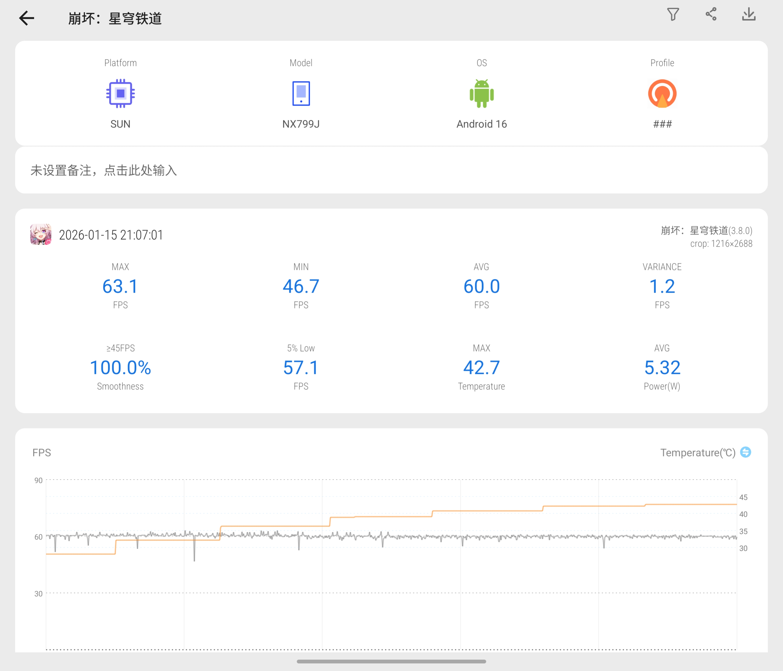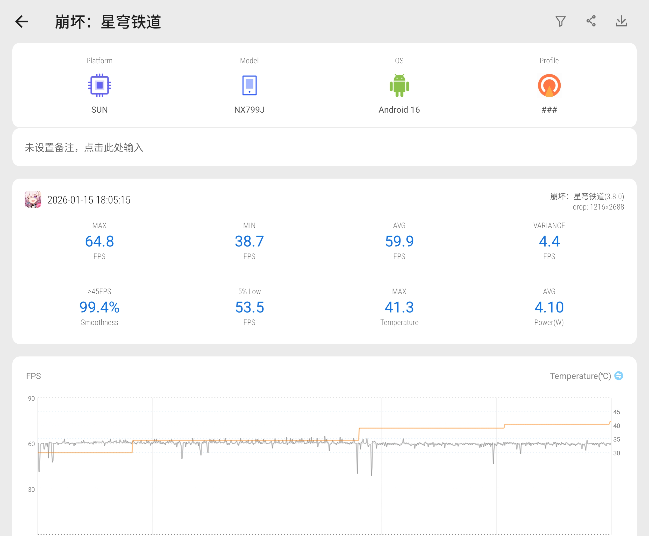 二十分钟测试下来,帧率表现那是相当的稳。根据Scene的记录,平均帧率几乎就是贴着60帧在跑,波动极小。