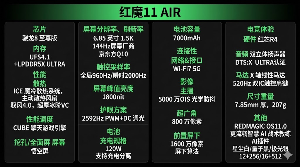 对于那些嫌弃主流旗舰散热差、打游戏降频,受够了主流旗舰那凸起巨大的摄像头,但又接受不了传统游戏手机那种杀马特造型和厚重手感的用户来说,红魔11 Air简直就是为你量身定做的选择。