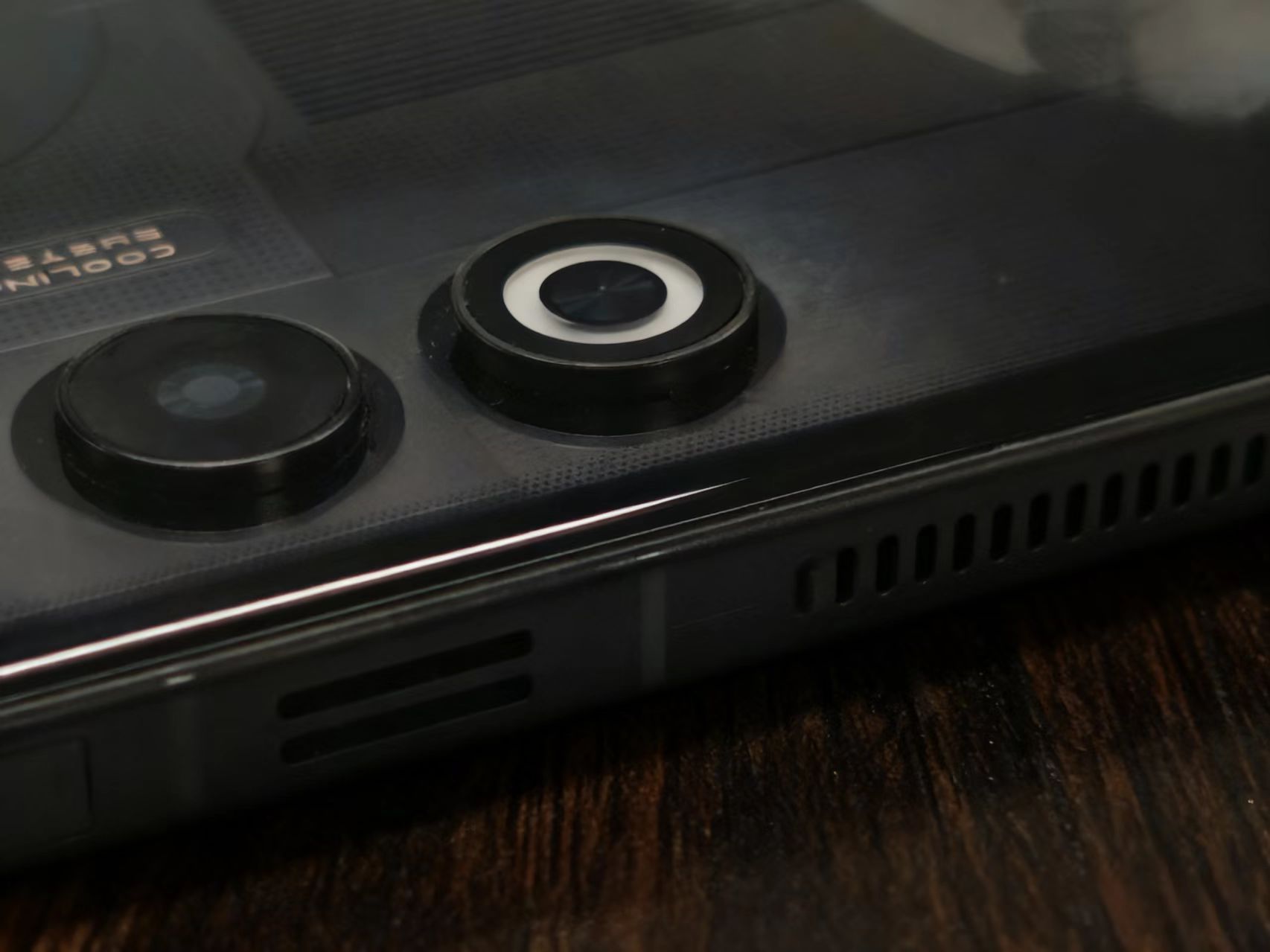 不得不佩服红魔的堆叠技术,他们硬是在这个寸土寸金的机身里,塞进了一颗实体离心风扇。进风口开在第二颗模组下面,出风口开在了中框侧边,如果不凑近看,你可能会以为那是扬声器开孔。