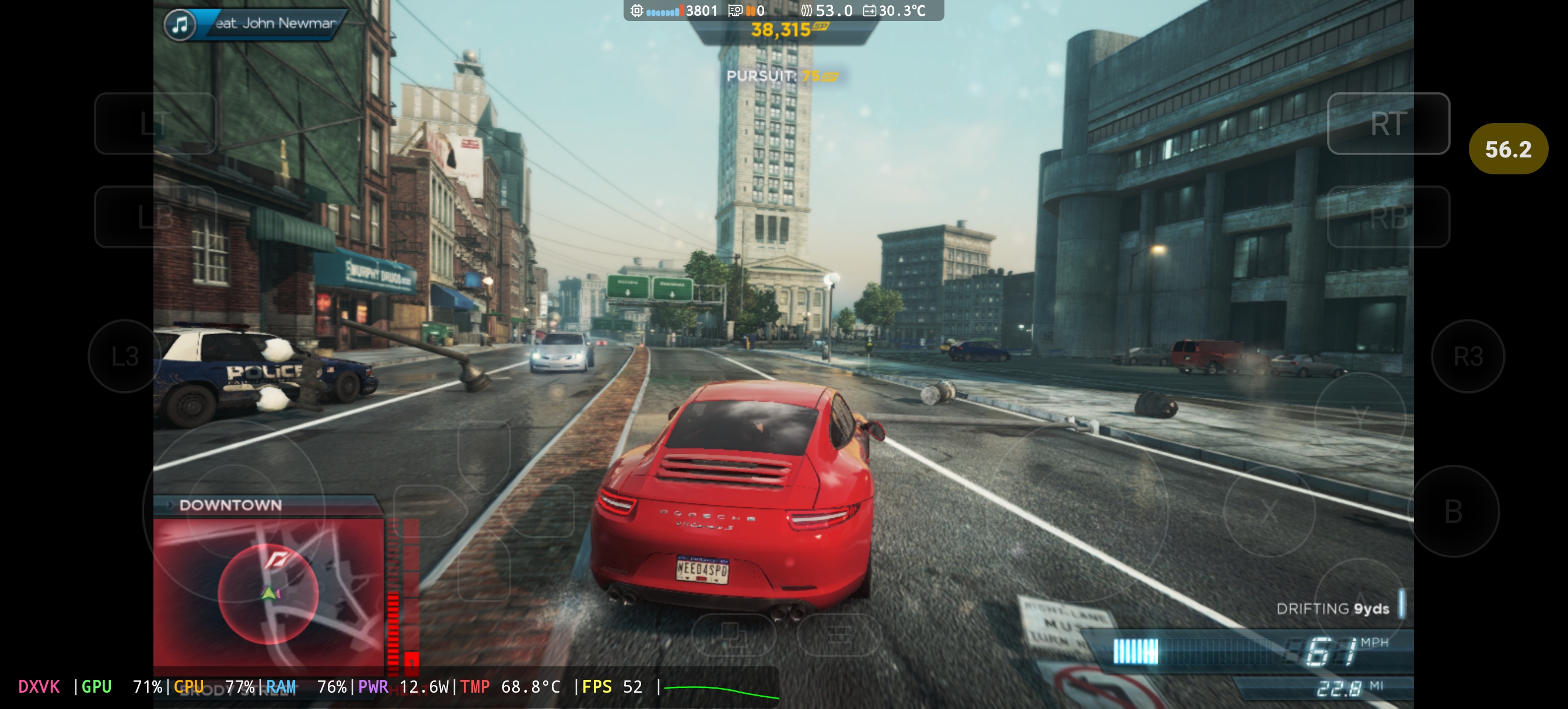 所以我这边也用红魔11 Air内置的PC模拟器,试了下经典的《极品飞车17:最高通缉》,搭配自己入手的联想拯救者G7手柄,帧率基本能稳定在45-55帧,平均功耗约12W,但是机身温度依然能控制得住。