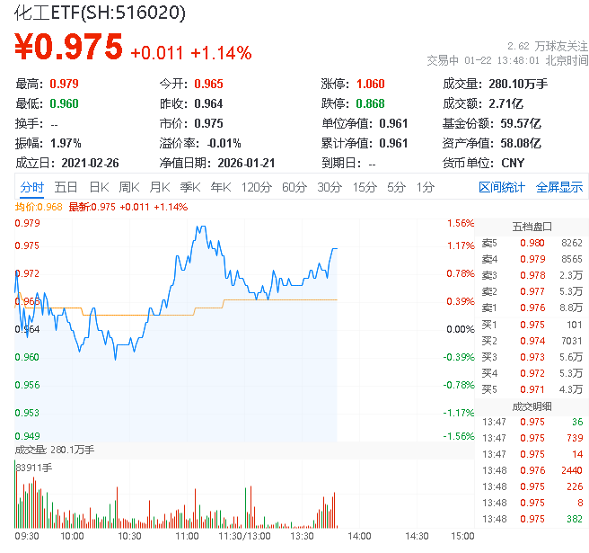 1月22日,截至13时47分,化工板块表现活跃,中证细分化工产业主题指数上涨1.41%,成份股方面,中简科技领涨8.59%,和邦生物上涨6.17%,龙佰集团上涨5.37%。
