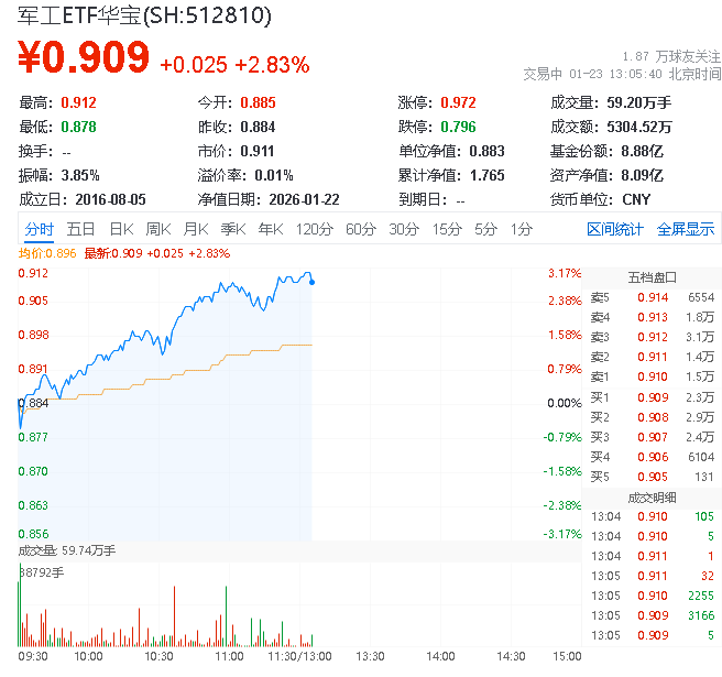 1月23日,截至13时5分,军工板块飙升,中证军工指数上涨3.15%,成份股方面,臻镭科技领涨20.0%,睿创微纳上涨20.0%,国博电子上涨14.57%。