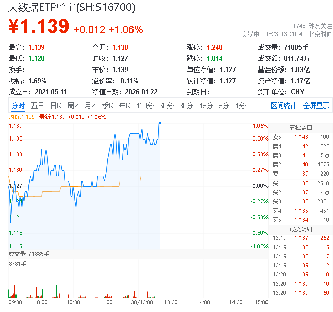 风险提示:大数据产业ETF(516700)被动跟踪中证大数据产业指数,该指数基日为2012.12.31,发布于2016.10.18,该指数近5年分年度涨跌幅为:2020年,3.57%;2021年,-3.5%;2022年,-25.68%;2023年,1.4%;2024年,10.57%,指数成份股构成根据该指数编制规则适时调整,其回测历史业绩不预示指数未来表现。本文中提及的指数成份股仅作展示,个股描述不作为任何形式的投资建议,也不代表管理人旗下任何基金的持仓信息和交易动向。基金管理人评估的该基金风险等级为R3-中风险,适宜平衡型(C3)及以上的投资者,适当性匹配意见请以销售机构为准。任何在本文出现的信息(包括但不限于个股、评论、预测、图表、指标、理论、任何形式的表述等)均只作为参考,投资人须对任何自主决定的投资行为负责。另,本文中的任何观点、分析及预测不构成对阅读者任何形式的投资建议,亦不对因使用本文内容所引发的直接或间接损失负任基金的过往业绩并不代表其未来表现,基金管理人管理的其他基金的业绩并不构成基金业绩表现的保证,基金投资须谨慎。