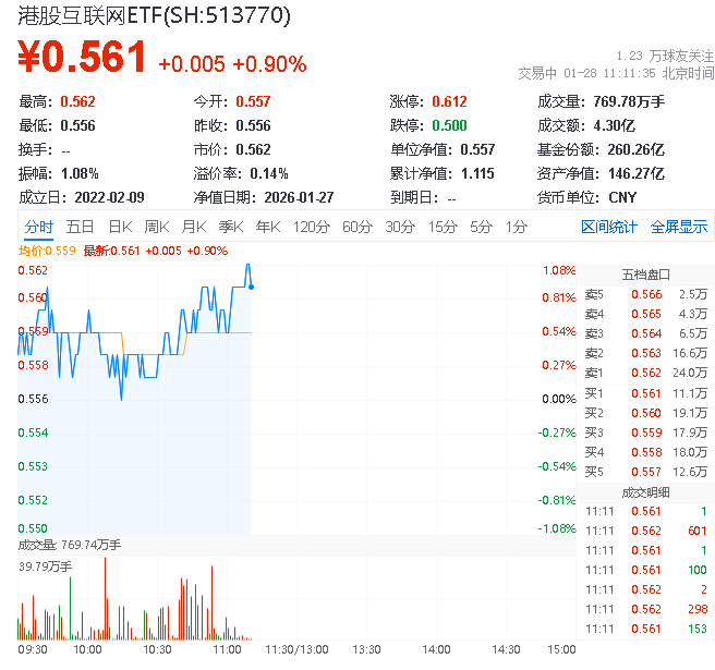 1月28日,截至11时10分,港股科网股表现活跃,中证港股通互联网指数上涨1.33%,成份股方面,心动公司领涨6.36%,阿里健康上涨4.2%,哔哩哔哩-W上涨3.32%。