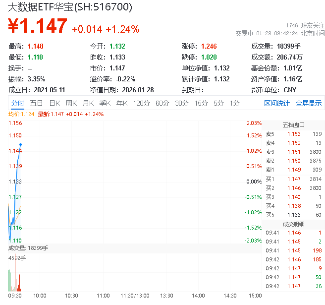 1月29日,截至9时41分,大数据产业板块表现活跃,中证大数据产业指数上涨1.05%,成份股方面,科大讯飞领涨6.26%,易点天下上涨4.98%,优刻得-W上涨4.89%;浪潮信息下跌1.77%,云赛智联下跌1.35%,云天励飞-U下跌1.29%。