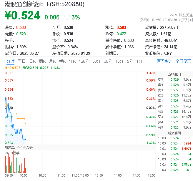 1月30日,截至10时3分,股票型基金表现平淡,港股通创新药ETF(520880)下跌1.13%,成份股方面,药捷安康-B领涨6.62%,同源康医药-B上涨4.75%,诺诚健华上涨3.01%。