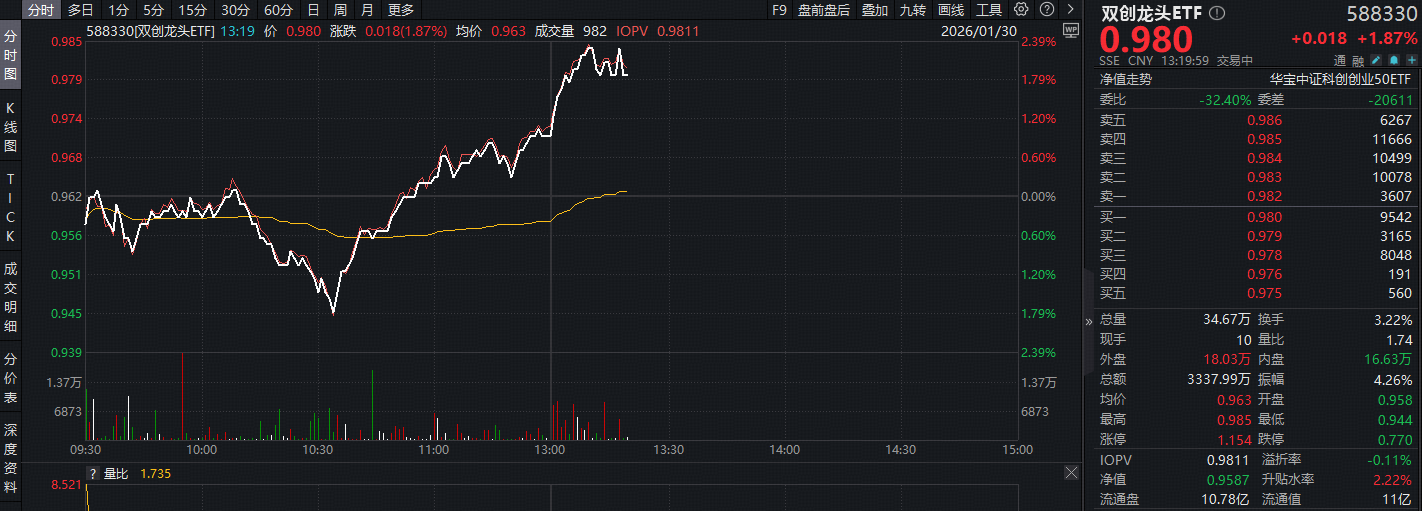 1月30日午后,创业板指率先翻红,现涨超1.8%,科创板亦跟随飘红,覆盖科创板+创业板高成长龙头的硬科技宽基——双创龙头ETF(588330)下探回升,场内价格盘中涨超2.2%,现涨1.87%。