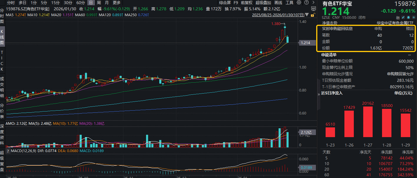 1月最后一个交易日(1月30日)有色金属出现罕见的跌停潮,板块热门ETF——有色ETF华宝(159876)全天深陷水面以下,场内价格最低下探9.98%,最终收跌9.61%,然而资金却逆市增仓,呈现“越跌越买”的态势,该ETF全天获资金净申购1.56亿份。